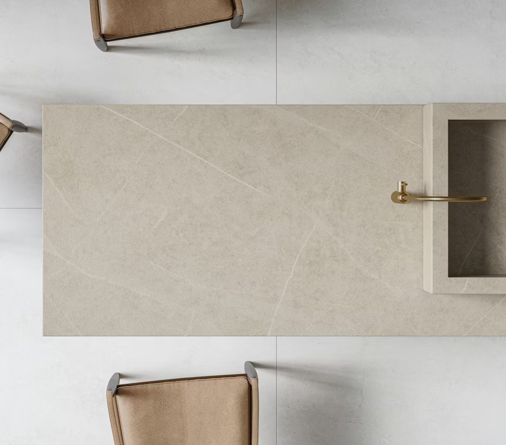 Dekton Sandik, İspanyol Crema Marfil mermerinin geleneksel zarafetini pürüzsüz yüzeyi, kremsi arka planı ve ince gri dokunuşlarıyla modern bir yorumla sunar. Sıcak ve dengeli renk yapısı sayesinde minimalist tasarımlar için zamansız bir estetik oluşturur.